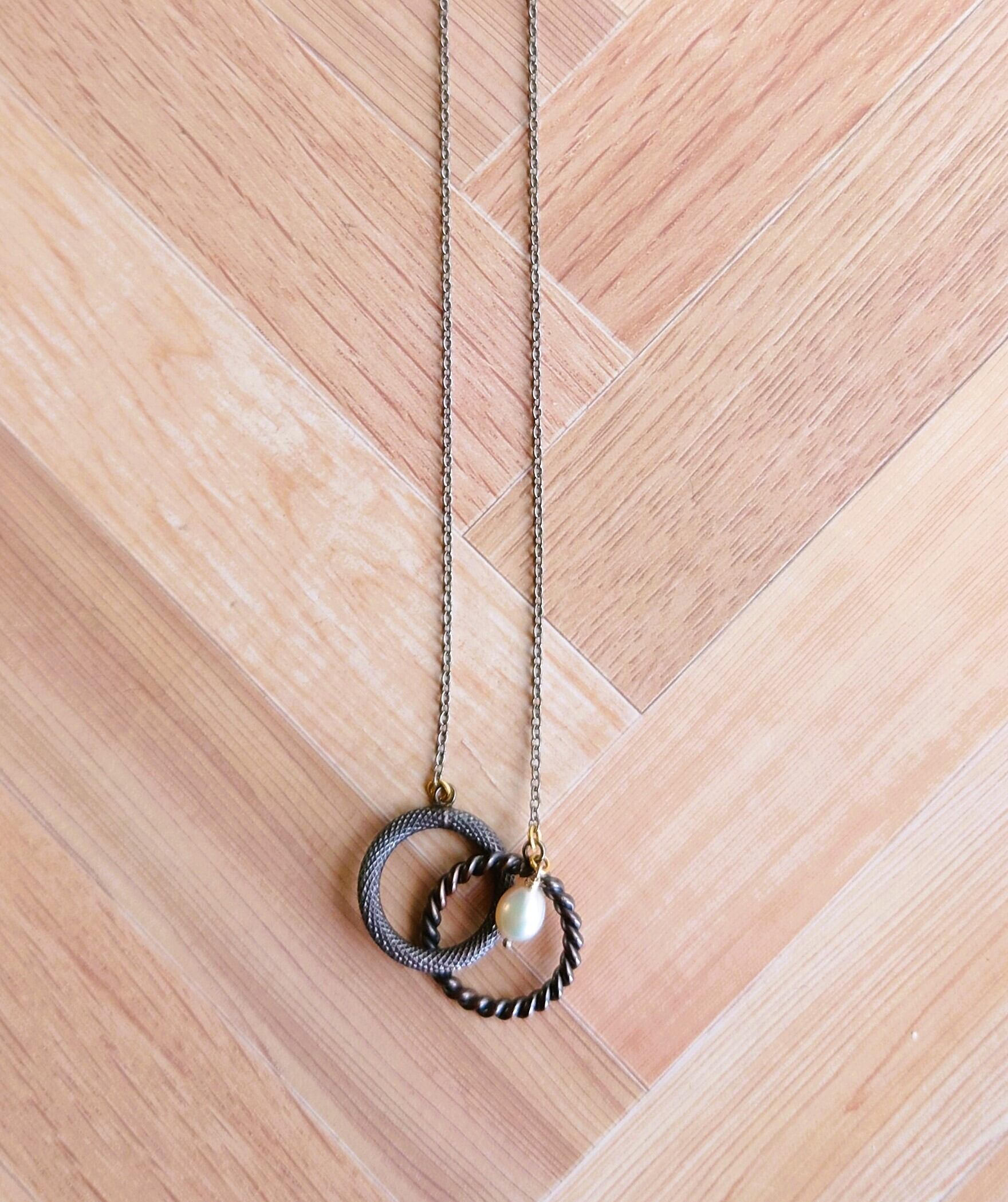 古美仕上げをした銅のチャームを二つ繋げたラスティーな雰囲気のペンダントです