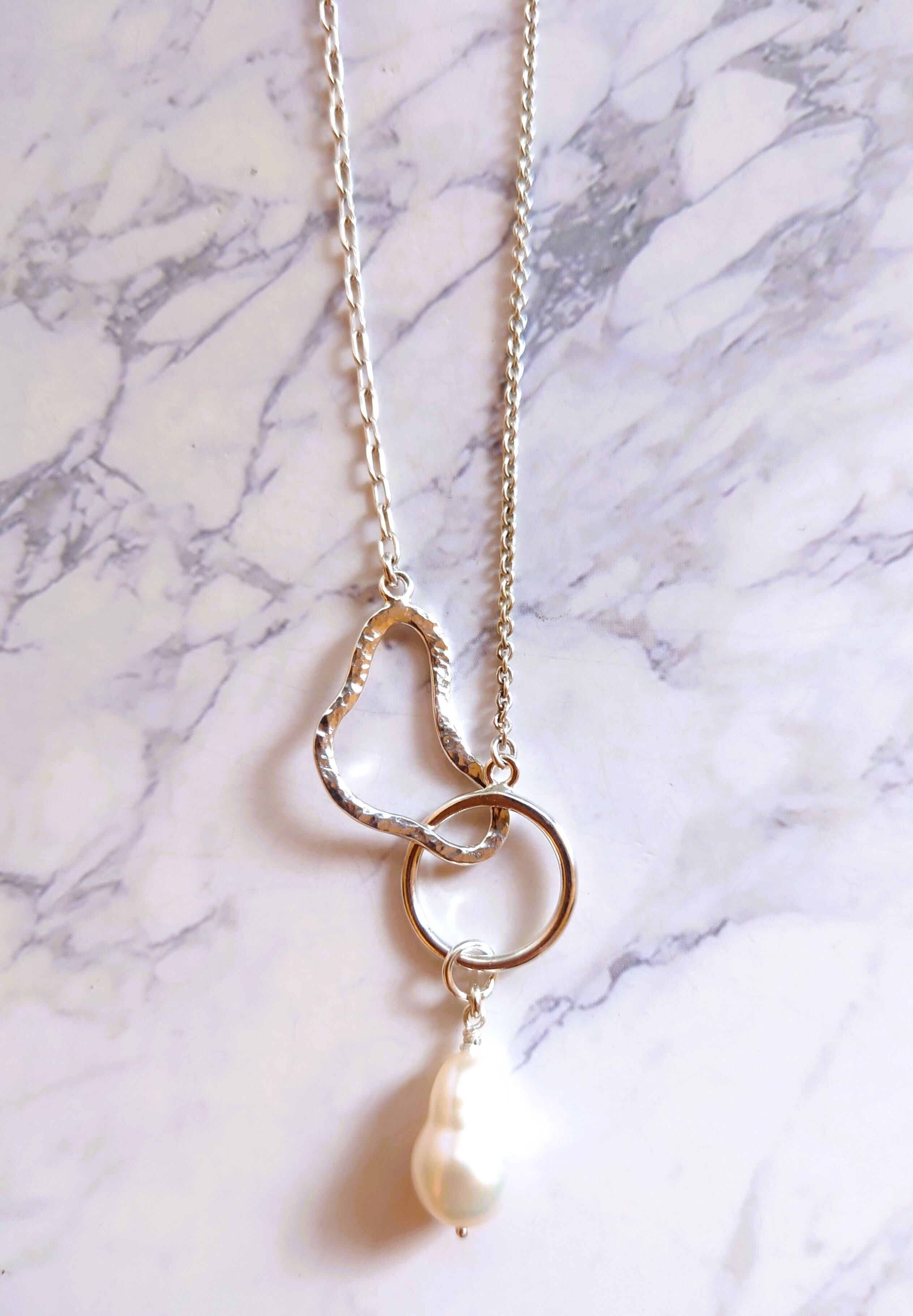 シルバーの雲形パーツと輪っかのリンクにバロックパールを一粒ぶら下げたペンダントです。